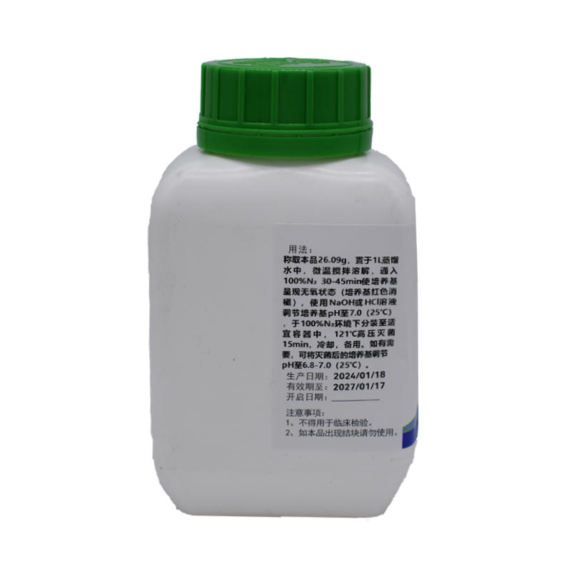 稱取本品26.0g,置于1L蒸餾水中,微溫攪拌溶解,通入100%N2 30-45min使培養(yǎng)基呈現無氧狀態(tài)(培養(yǎng)基紅色消褪),使用NaOH或HCl溶液調節(jié)培養(yǎng)基pH至7.0(25℃),于100%N2環(huán)境下分裝至適宜容器中,121℃高壓滅菌15min,冷卻,備用。如有需要,可將滅菌后的培養(yǎng)基調節(jié)pH至6.8-7.0(25℃)。