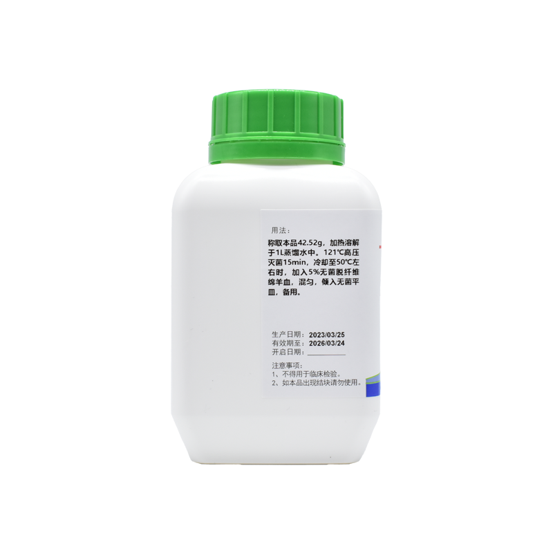 稱取本品42.52g,加熱溶解于1L蒸餾水中。121℃高壓滅菌15min,冷卻至50℃左右時(shí),加入5%無菌脫纖維綿羊血,混勻,傾入無菌平皿,備用。